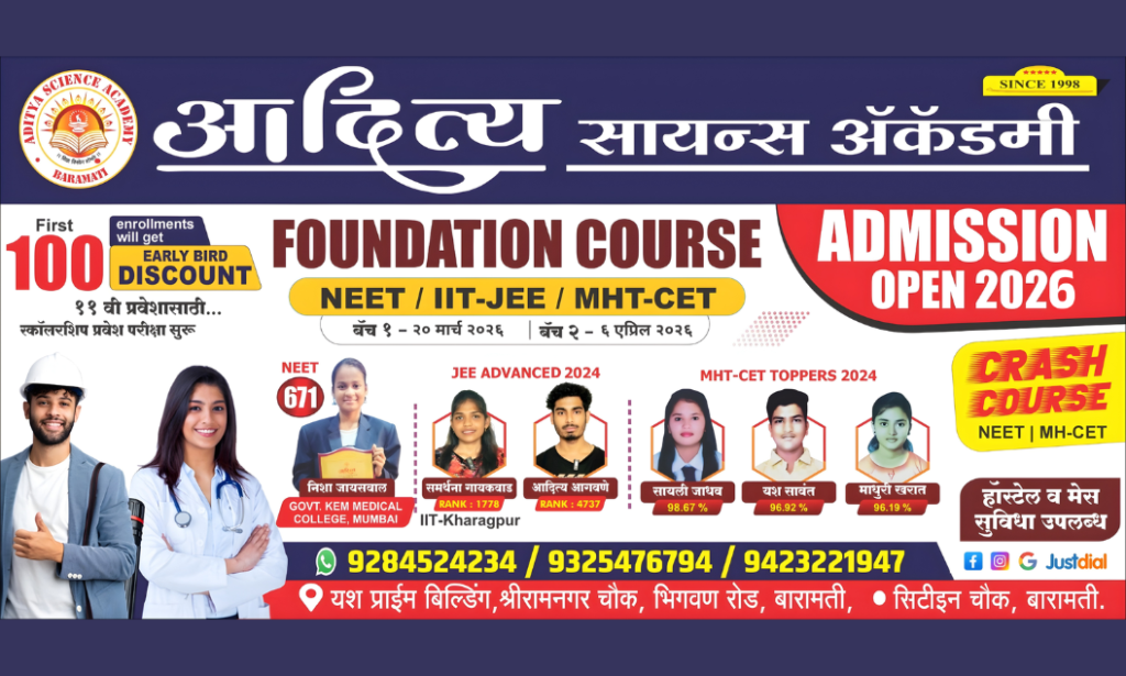 Aditya Science Academy is one of the most successful educational institutions in Maharashtra, now located in Baramati. We specialize in providing top-tier coaching for competitive exams like NEET, JEE, MHT-CET, NDA, and more. Our academy is known for consistently producing excellent results, making us the only academy in Maharashtra with the best outcomes for these exams.